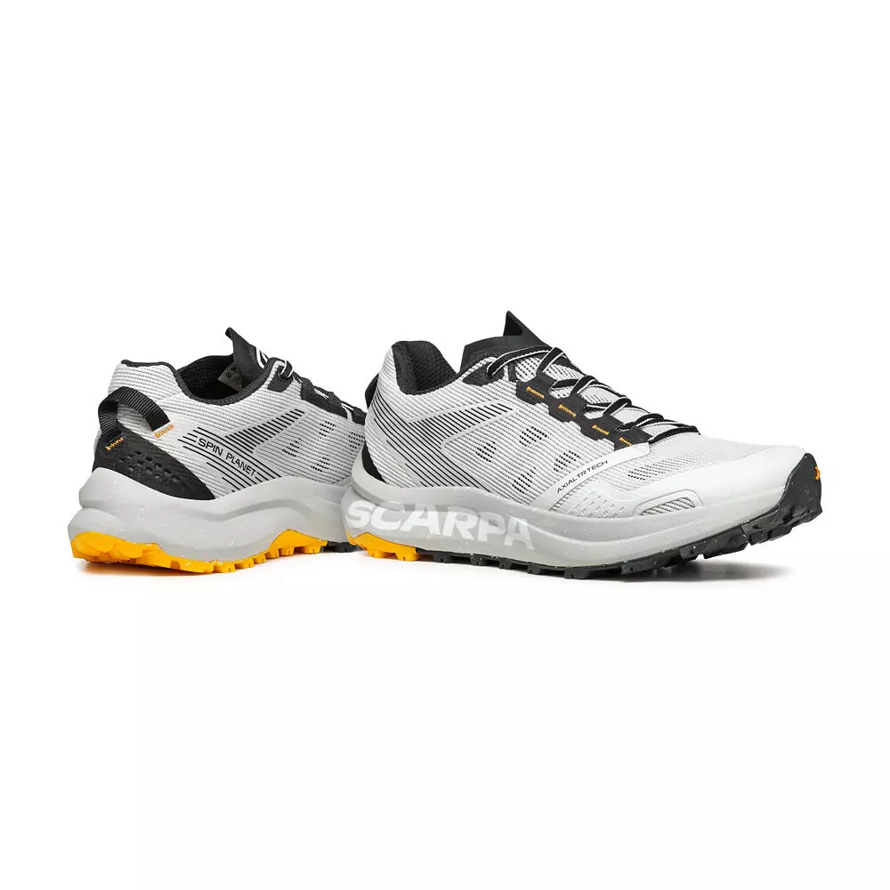 Следващата стъпка в пътуването на Scarpa за устойчиво развитие, SPIN PLANET въвежда нова концепция в категорията Trail Running с горната си част, която е изработена от 100% рециклирани материали, докато EVA междинната подметка е 45% рециклирана, а гумената външна подметка е 30% рециклирана. Идеалните обувки за бегачи, които преследват дълги разстояния по трейл пътеките, благодарение на обема на междинната подметка, предназначен да абсорбира ударите със земята и да осигури защитно омекотяване.