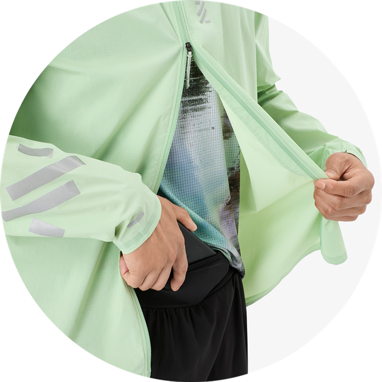 Якето Nnormal Trail Wind е изключително леко и ветроустойчиво, създадено за планинско бягане и активности на открито. Изработено от 100% рециклиран, мек на допир полиестер и с тегло около 123 г, то осигурява отлична компактност и свобода на движение. Двупосочният цип отпред позволява лесен контрол на вентилацията, а светлоотразителните детайли гарантират видимост при слаба светлина. Благодарение на регулируемата качулка и дизайна, който позволява якето да се прибере в собствения си джоб, то е универсален избор за непредвидимо време по пътеките.